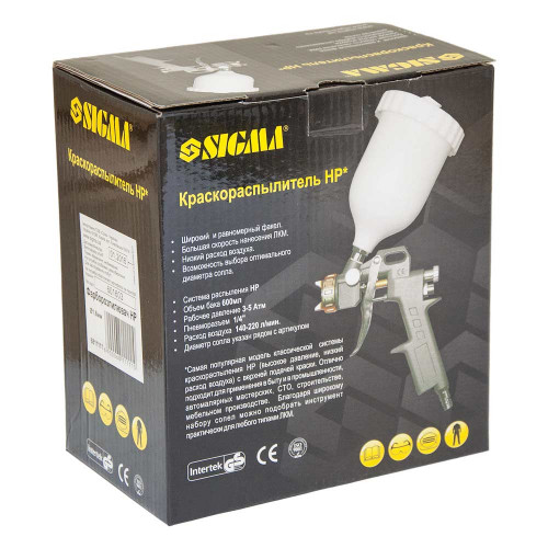 Краскораспылитель HP Ø1.8мм 85-225л/мин 3.5бар в/б 600мл (пласт) SIGMA (6811111) с классической системой распыления HP (высокое давление, низкий расход воздуха) с верхней подачей краски.