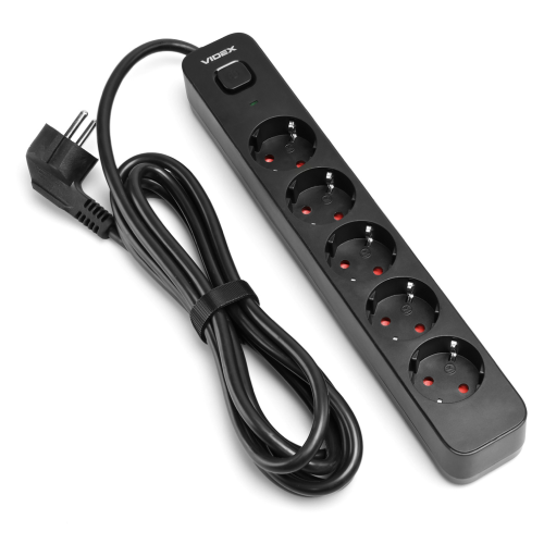 Подовжувач мережевий Videx Oncord з кнопкою з/з 5 постів (1.5 мм) 3 м чорний